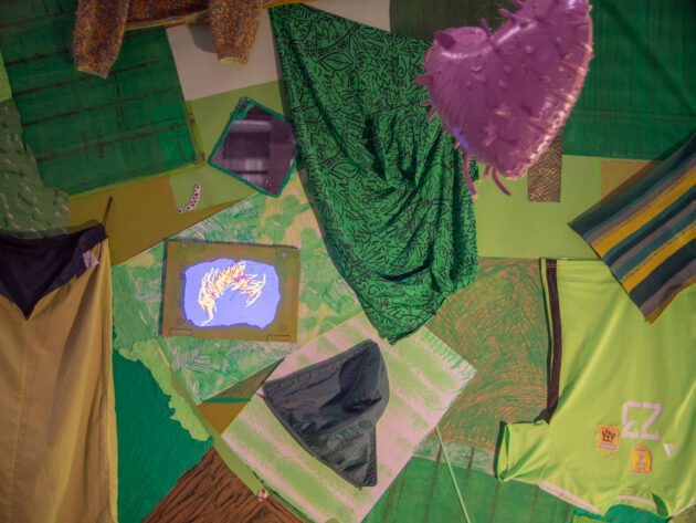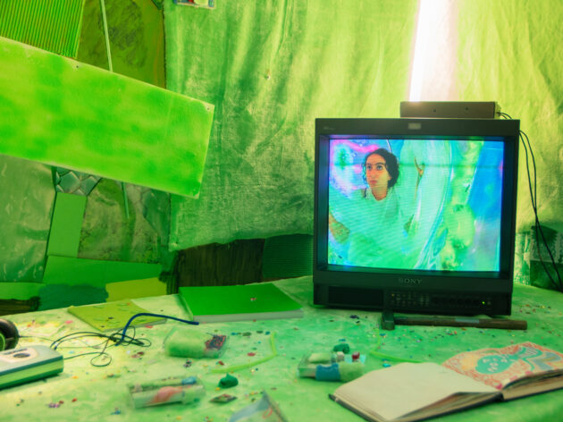 each sound you hear is my voice, both as an instrument and as a raw, singing declaration. the installation reveals the material world around this sonic body: a fragmented work in process paired with ai-generated videos, fine-tuned on crying and not-so-crying selfies, abstract drawings, handwritten notes, bright textures and other materials.