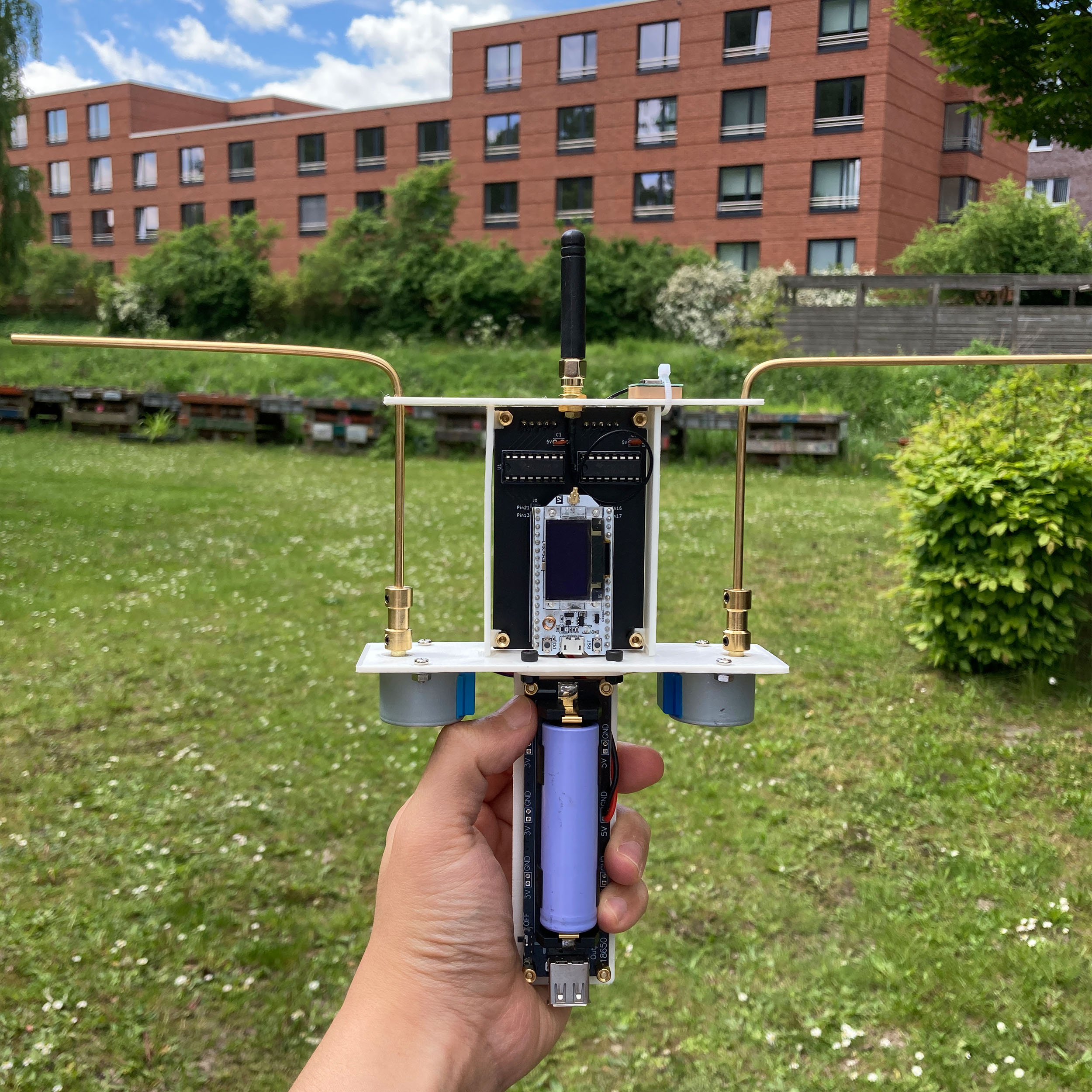 This apparatus considers data collection activity from the stacks of networks as a creepy gaze from the hyperobject in the form of electromagnetic pulses and represents its magnitude as a rotation of two brass rod. The more the device detects the density of artificial signals nearby, the stronger the gaze it represents. Thus, the device make the brass rod rotate further based on the magnitude of the signal.
