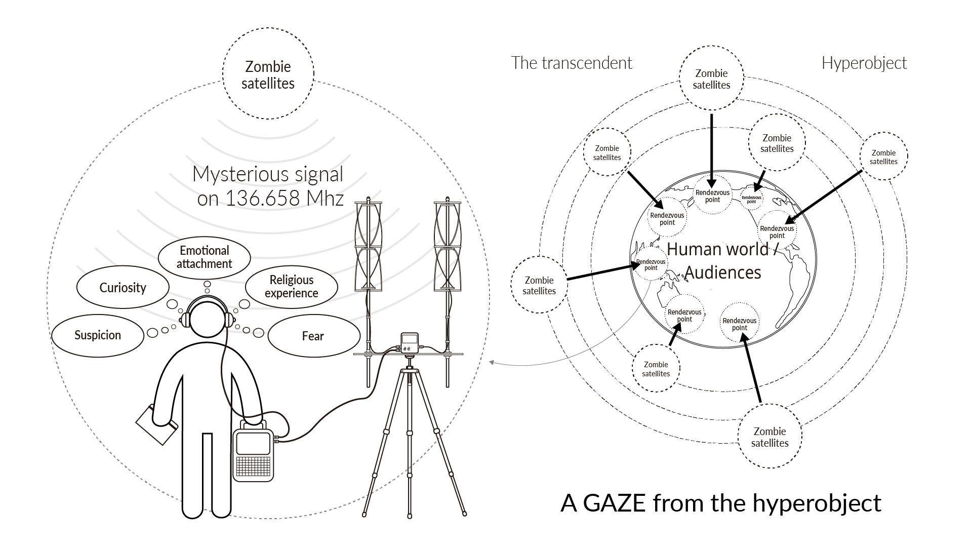 The imaginary character receives the signal from the zombie satellite without knowing whether it exists or not. She/He then creates and assigns a unique name to the origin of the signal and leaves a record of his tracking activities.
